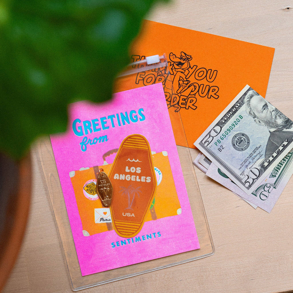 Médaille Los Angeles issue de la collection "Greetings from" en collaboration avec Camille Gressier. Livrée dans sa pochette avec une illustration de Camille Gressier et un sticker !