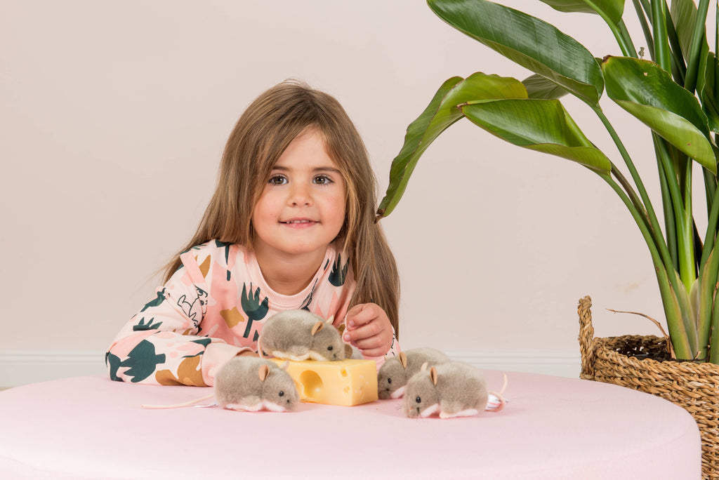 La jolie souris grise ne manquera pas d'attirer tous les regards. Les jolies oreilles, les yeux noirs, les moustaches réalistes, les jolis pieds et la queue rose témoignent d'une grande attention portée aux détails et la fourrure incroyablement douce invite à caresser et à câliner.