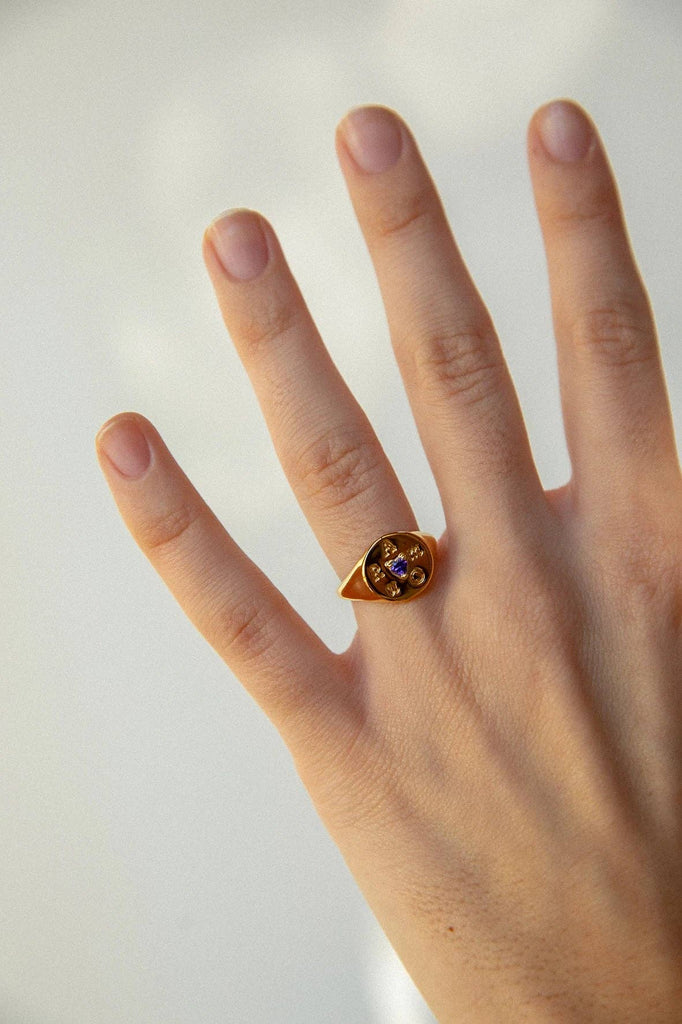 Chevalière Amour issue de la collection Confettis, en Plaqué Or et pierre zircon violette. Fabriquée à la main par notre atelier.