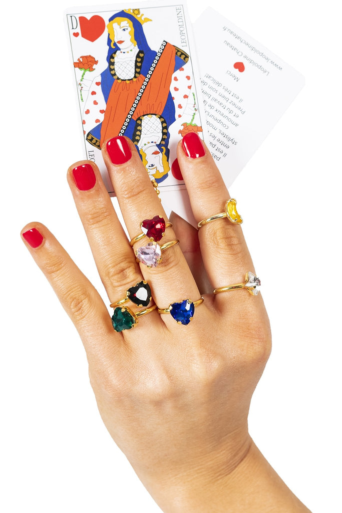 Bague de notre enfance en laiton plaquée or et pierre fantaisie en forme de cœur prise dans des griffes.