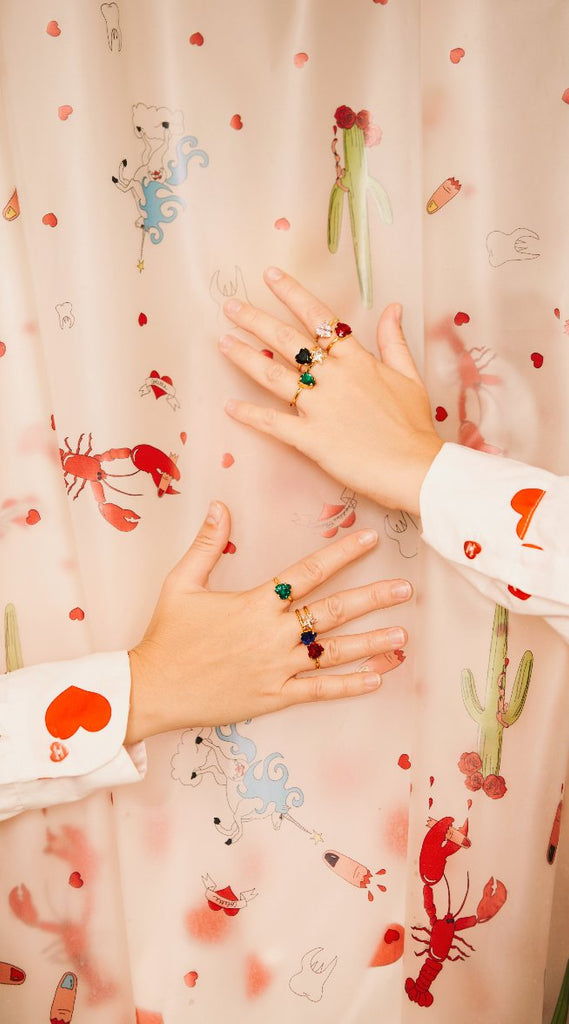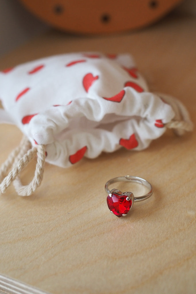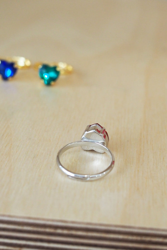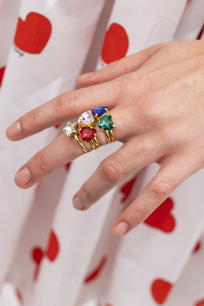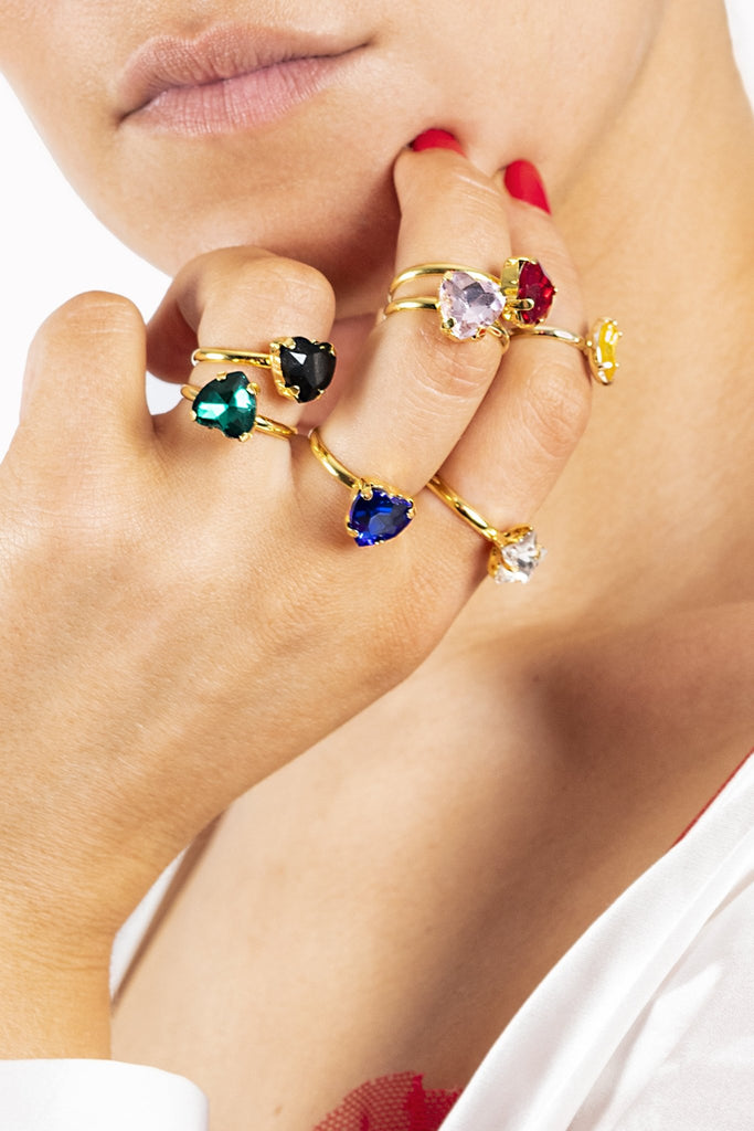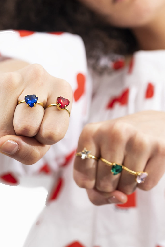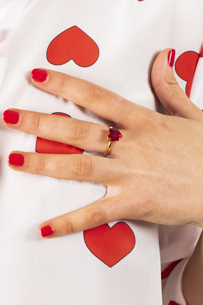 Bague en laiton plaquée or et pierre fantaisie en forme de cœur prise dans des griffes.