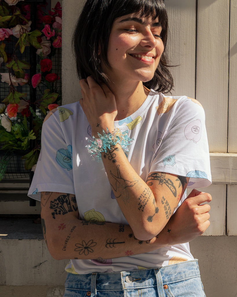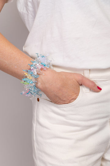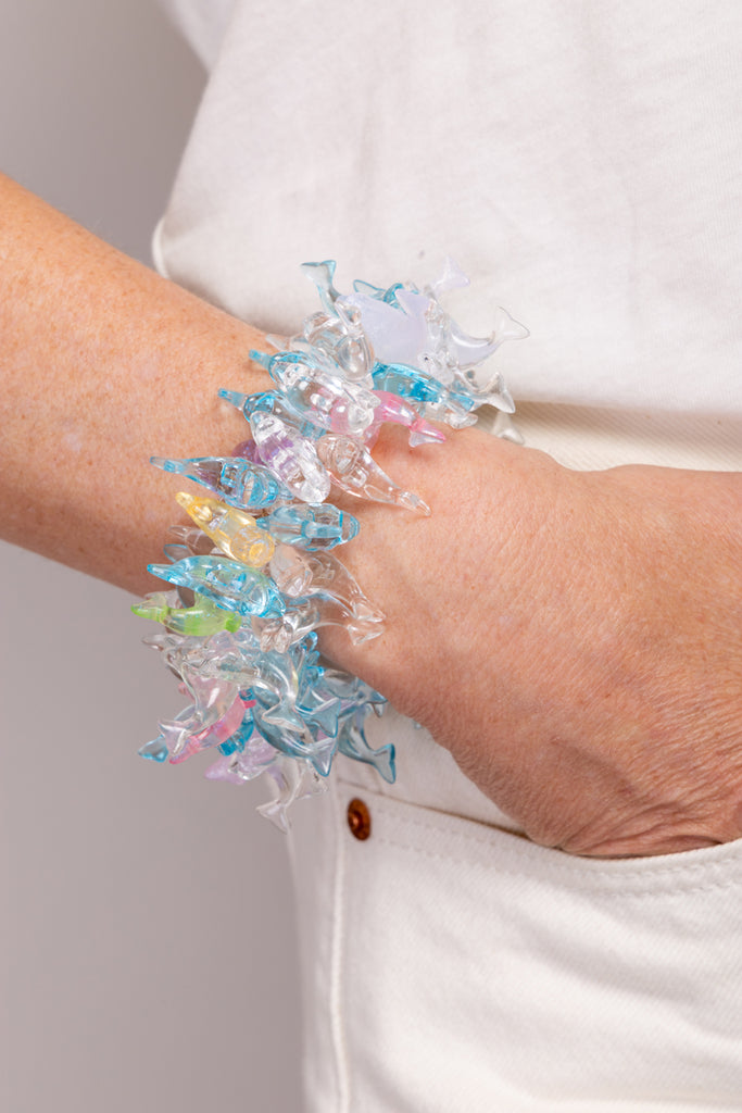 Bracelet élastiqué avec une multitude de dauphins en résine pastels de notre enfance.