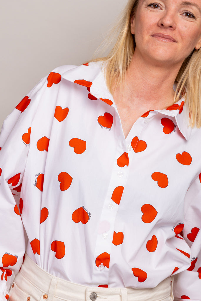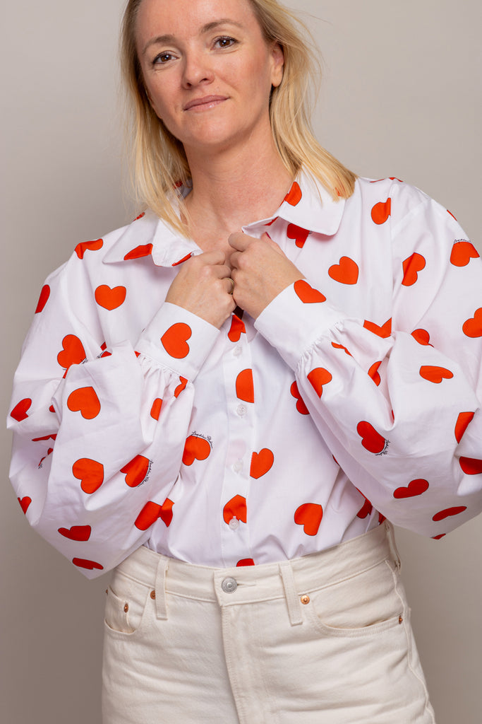 Apportez une touche de fantaisie à votre look avec notre chemisier Electra à coeurs Doté de larges manches bouffantes, ce chemisier boutonné milieu devant offre un style unique et original. Le chemisier se porte facilement avec une jupe ou un jean.