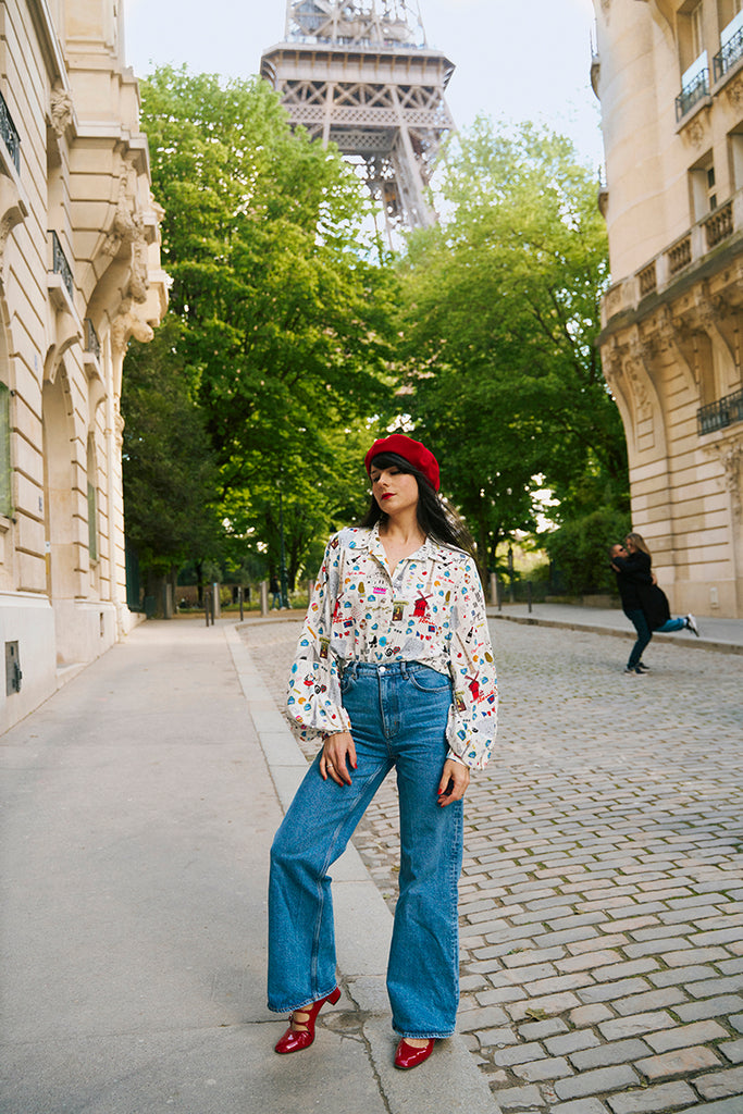 Chemisier avec des larges manches bouffantes, boutonné milieu devant.