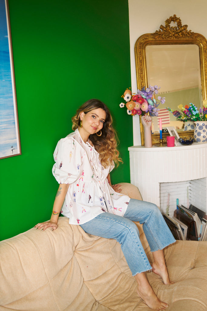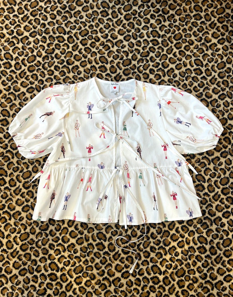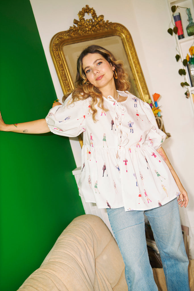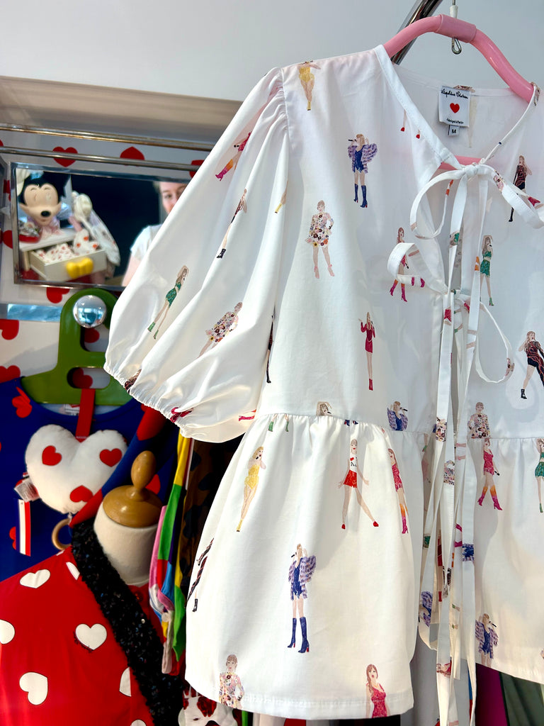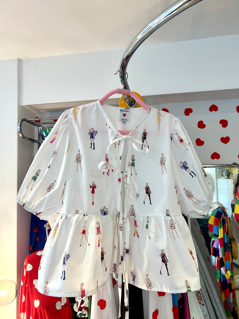 Apportez une touche de Swift à votre look avec notre top en popeline imprimée "Taylor". Doté de larges manches bouffantes, ce chemisier noué milieu devant offre un style unique et original.