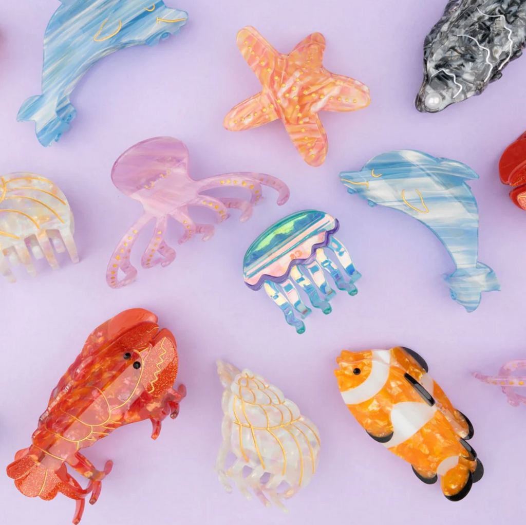 Une belle pince à cheveux homard XL, idéale pour les cheveux longs ou épais. Grâce à sa couleur rouge orangée flamboyante soulignée de paillettes, ses détails dorés et ses jolis strass noirs en guise de mirettes, cette pince à cheveux ressort à merveille dans nos chevelures, soulignant nos airs de sirène. Un animal marin aussi graphique que rétro pour des coiffures de reines de l’océan !