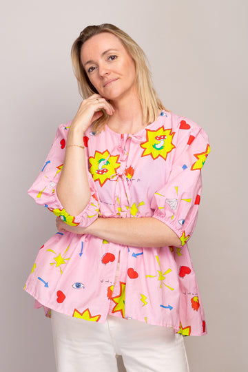 Apportez une touche de fantaisie à votre look avec notre top en popeline imprimée. Doté de larges manches bouffantes, ce chemisier noué milieu devant offre un style unique et original.