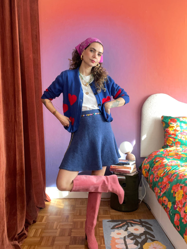 Cardigan fin CHARLOTTE Bleu Jacquard Coeurs Rouge