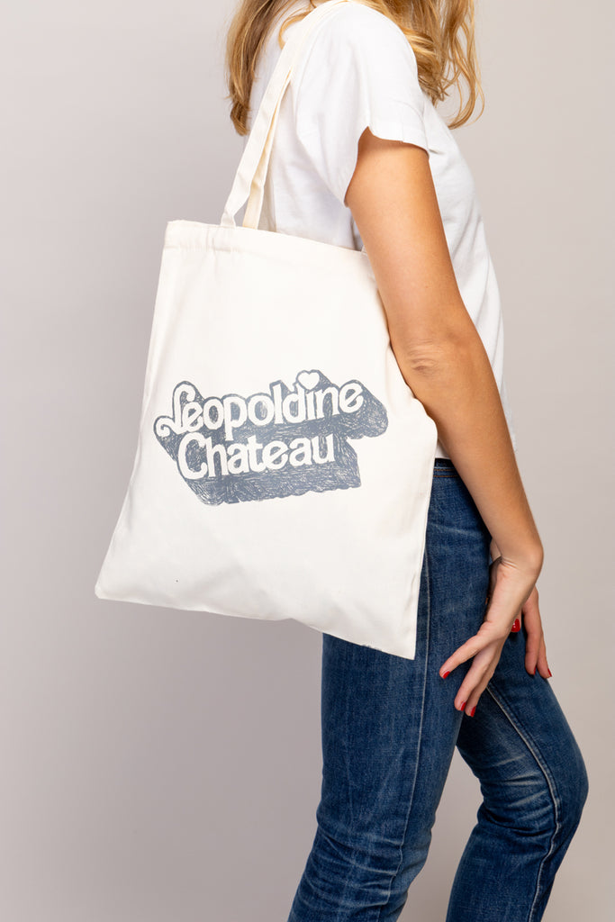 Le tote bag au logo Léopoldine Chateau sur l'endroit et imprimé "Britney" sur l'envers.