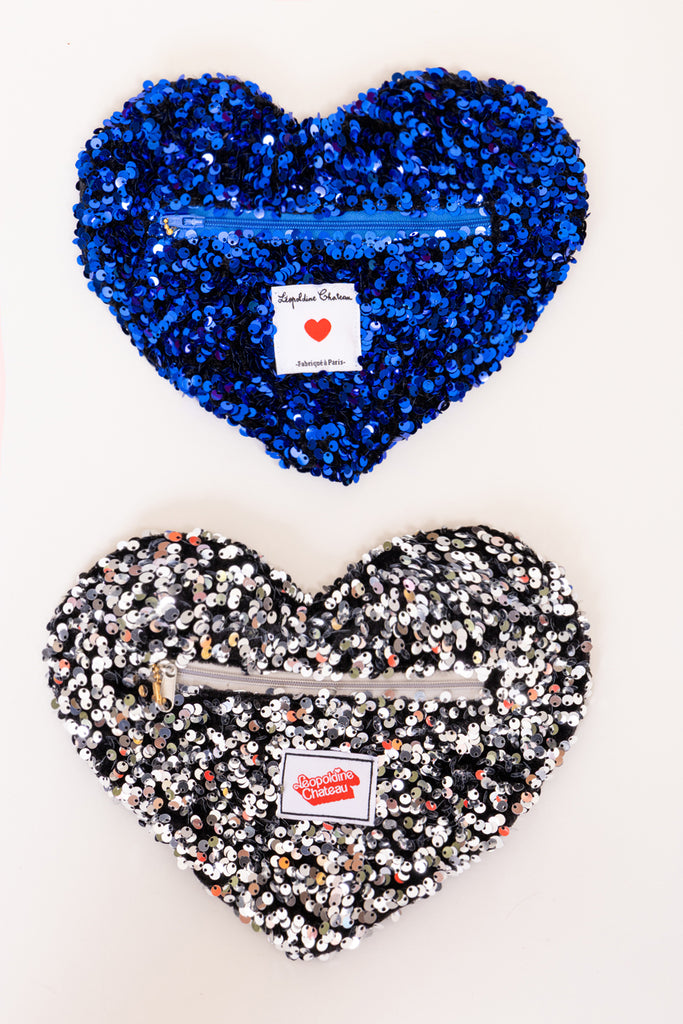 Pochette en forme de coeur en paillettes doublée dans un imprimé Léopoldine Chateau et se fermant avec un zip