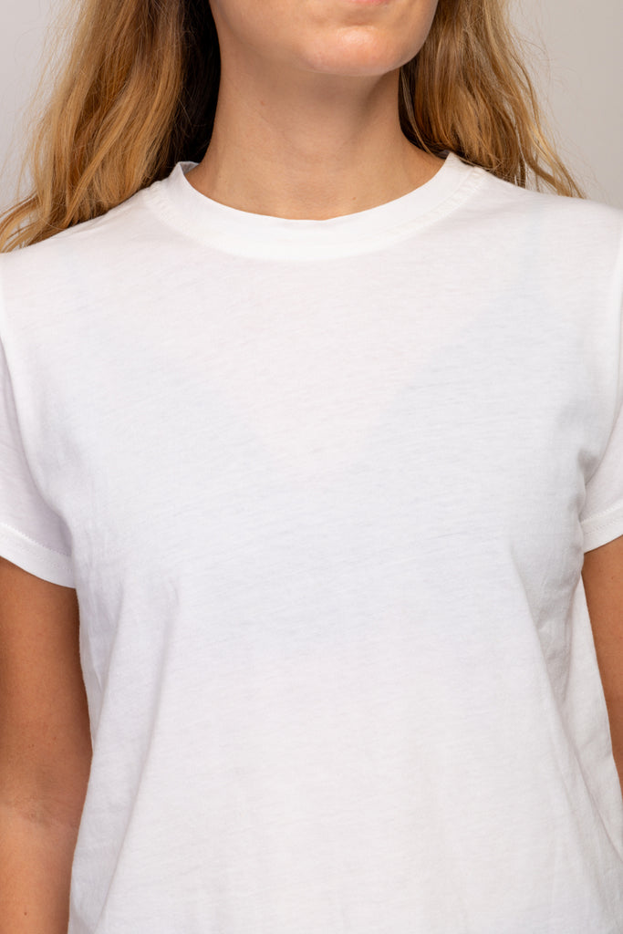 Notre tee-shirt Lucie est court avec une forme carrée. Le tee-shirt peut se porter facilement avec un jean taille haute.