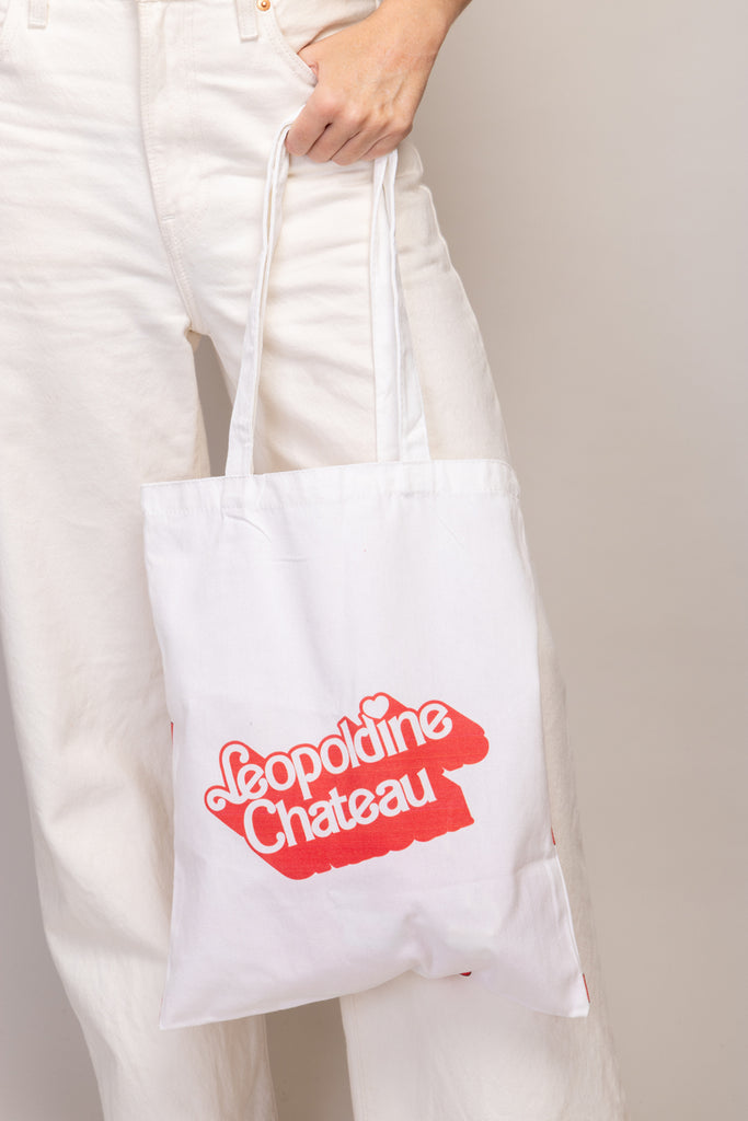 Le tote bag au logo Léopoldine Chateau sur l'endroit et imprimé coeur sur l'envers.