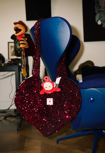 Tote-bag en forme de coeur avec deux anses et la possibilité de le porter en bandoulière.